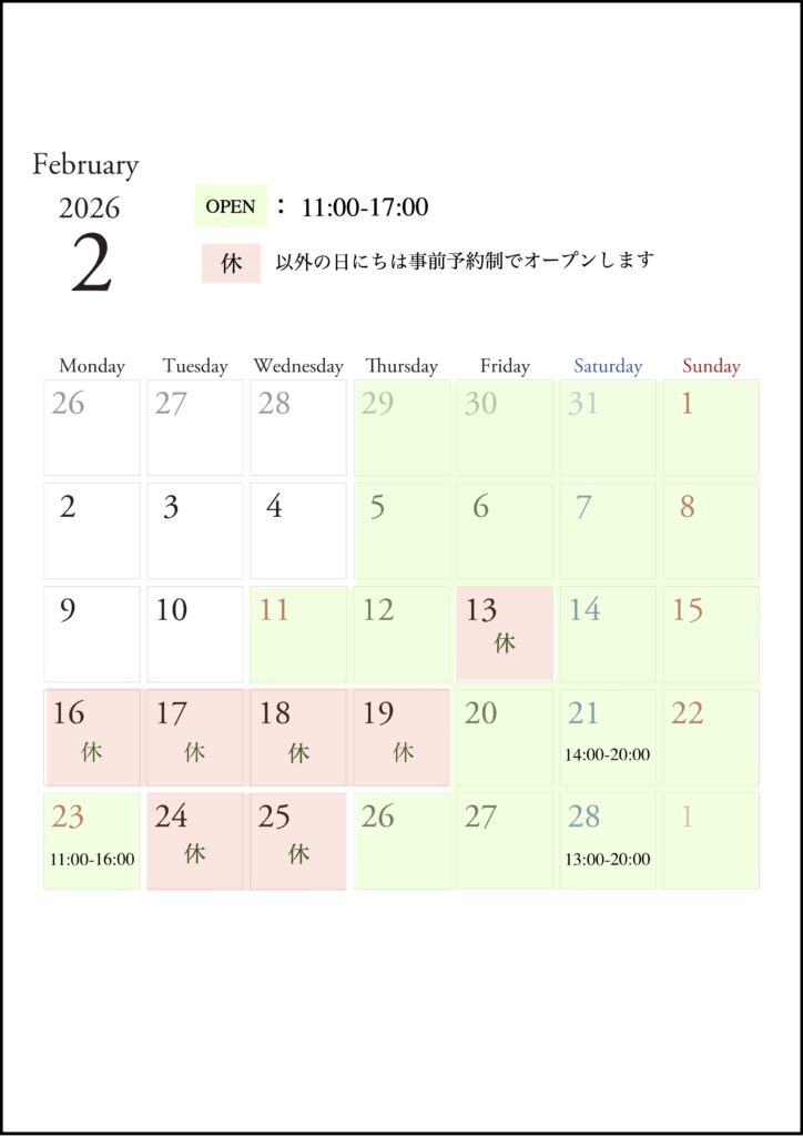 2026-02-01 2026年2月の営業日 . 2月の山鹿といえば、竹あかりのイベント「百華百彩」。 毎週金・土曜の夜に、豊前街道が竹あかりと和傘の灯火に包まれます。 21日・28日は夜営業しますので、百華百彩にお越しの際はぜひお立ち寄りください。 2月も山鹿でお待ちしております♪ Home › お知らせ › 2026年2月の営業日 関連記事 2023年11月の営業日と第5回 はじっこマルシェ開催! 2021年7月の営業日 2024年3月の営業日 【リアルスタイル】での取り扱いがスタートしました 2019年12月の営業日 2026年1月の営業日